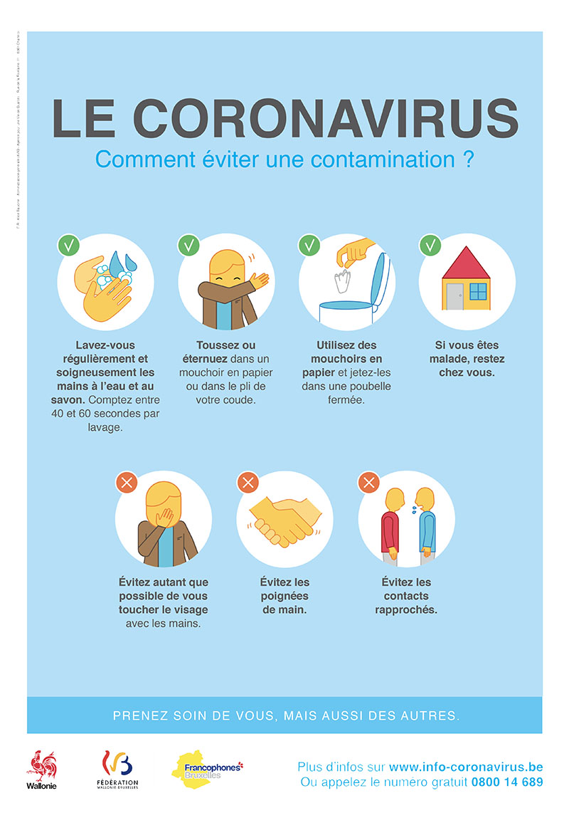 Des mesures de nettoyage et de désinfection renforcées doivent être mises en place au sein des milieux d’accueil. Nous vous demandons de suivre rigoureusement les mesures générales d’hygiène et de nettoyage du milieu d’accueil dans le contexte d’épidémie de coronavirus qui vous seront fournies via une communication à suivre.