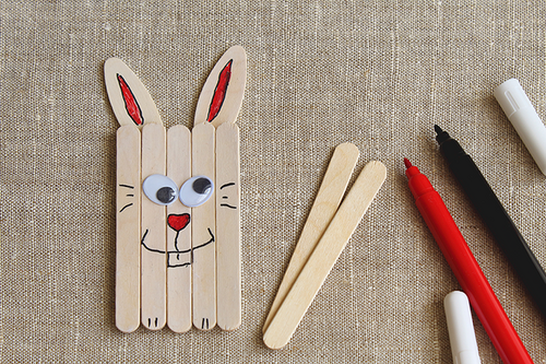 Collez 4 à 5 bâtons ensemble et ensuite peignez-les ou dessinez des formes dessus. Ajoutez des éléments comme bon vous semble. Vous pouvez également créer une fleur en vous servant d’un bâtonnet unique et en le collant à une partie d’une boîte à œufs par exemple.